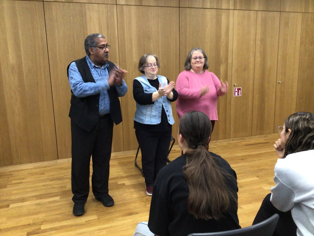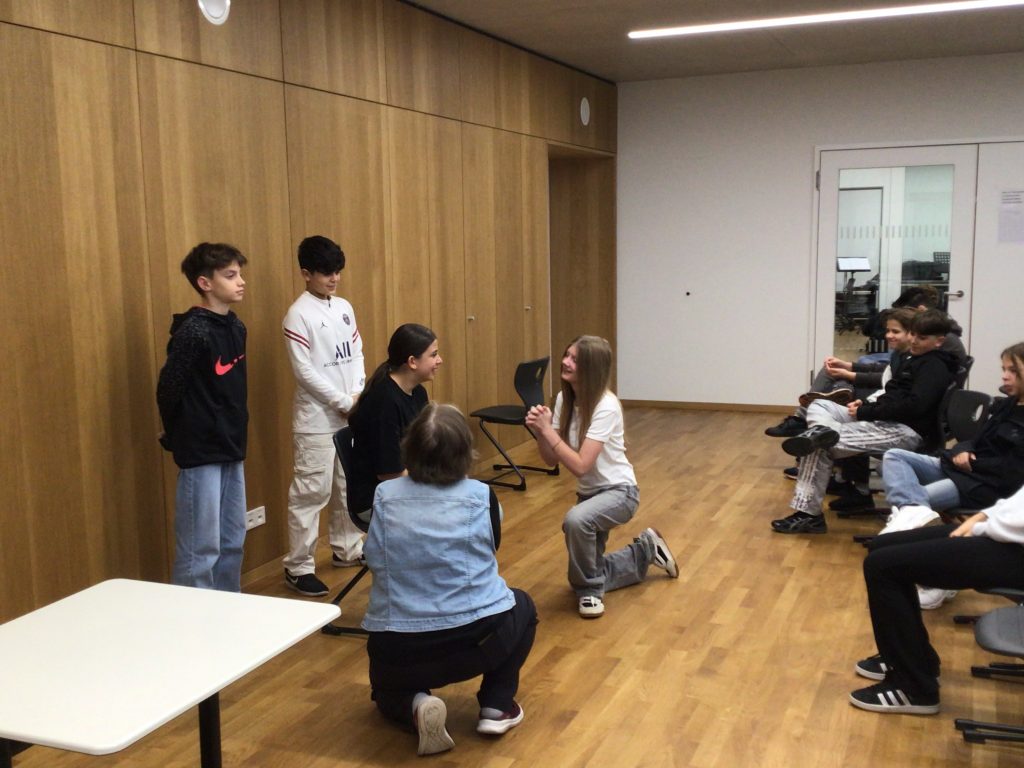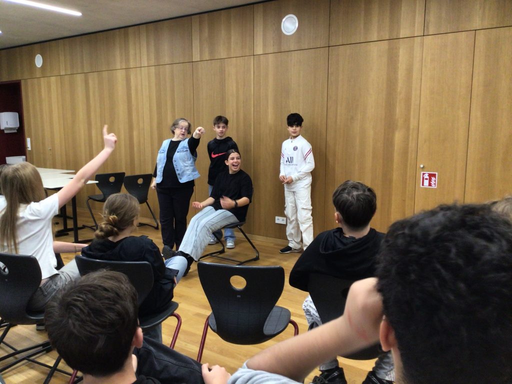 Jede Klasse von 7 – 9 erhielt in ihrem Klassenverband eine Vorführung der drei Schauspieler im Musiksaal und wurde dabei durch kurze Theaterstücke und Impulse zum Nachdenken, Lachen, Mitspielen und Englischsprechen angeregt. Die Schüler hatten viel Spaß mit der Theatergruppe und merkten, dass ihr Englisch schon gut ausreicht, um die Theaterstücke zu verstehen und sich in Englisch ausdrücken zu können.