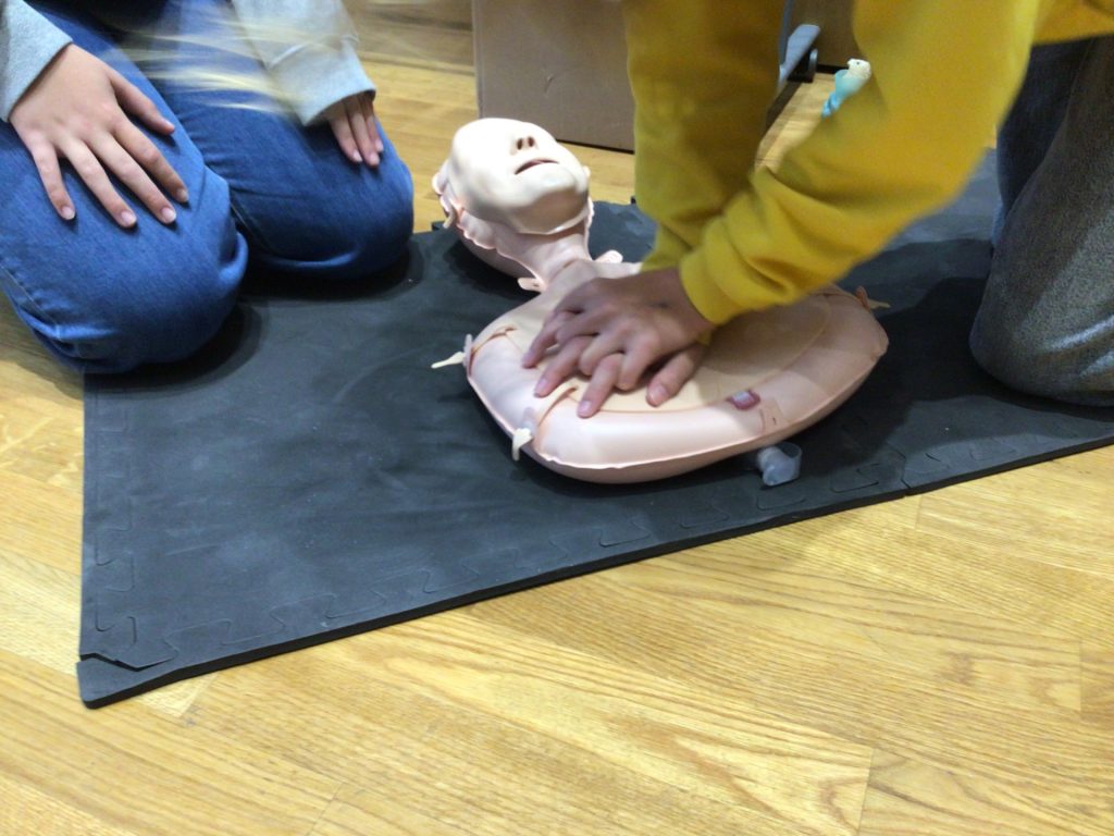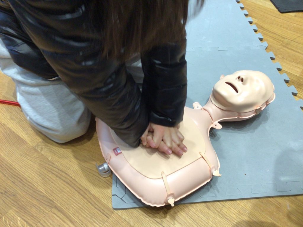 Jeder, der wollte, konnte an einer der Puppen ausprobieren was zu tun ist, wenn eine Person einen Herzstillstand hat und deshalb eine Reanimation bzw. Herzdruckmassage benötigt. Die Schüler lernten drei notwendige Schritte: Prüfen – Rufen – Drücken. Als Erstes muss man die Atmung überprüfen, dann den Notruf anrufen und drittens mindestens 100 x pro Minute die Herzdruckmassage durchführen so lange bis der Notarzt kommt.