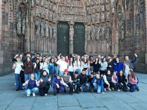 Treffpunkt war am Morgen des 07.05.2025 um 7.45 Uhr am Rathausplatz in Gerlingen. Dort starteten wir mit 55 Schülern sowie den Französischlehrkräften pünktlich um 8 Uhr mit dem Doppeldeckerbus. Nach zweieinhalb Stunden erreichten wir Straßburg.